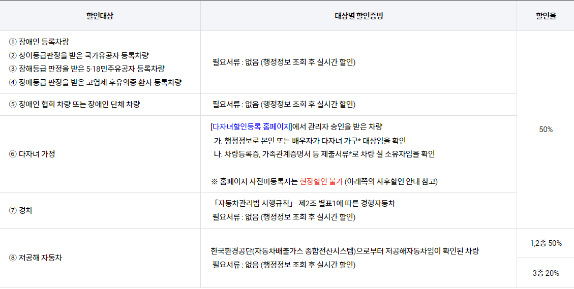 장애인, 국가유공자 등록차량, 다자녀, 경차, 저공해 차량1,2종(저공해 차량3종은 20%)
