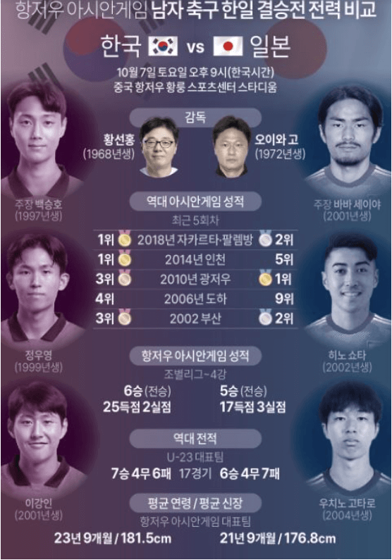 황선홍 감독이 이끄는 24세 이하 남자 축구대표팀이 7일 오후 9시(한국시간) 중구 항저우 황룽 스포츠 스타디움에서 영원한 라이벌 일본과 축구 결승전 경기가 있었습니다. 일본을 꺽고 2대1로 역전승을 이룬 한일전 경기 내용을 자세히 살펴보도록 하겠습니다.