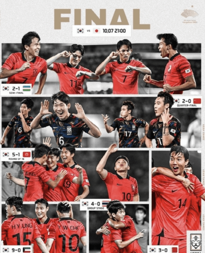별 부상 없이 경기를 승리로 이끈 대표팀 선수분들 모두 정말 수고 많으셨습니다. 공격적인 플레이로 덕분에 정말 흥미로웠고, 재밌게 즐겼습니다. 앞으로 대한민국 축구가 더 발전되기를 기대합니다. 다음 아시안게임은 2026년 아이치 나고야 아시안게임입니다.일본에서 열리는 아시안게임도 압도적인 경기로 우승할 거라 생각됩니다.