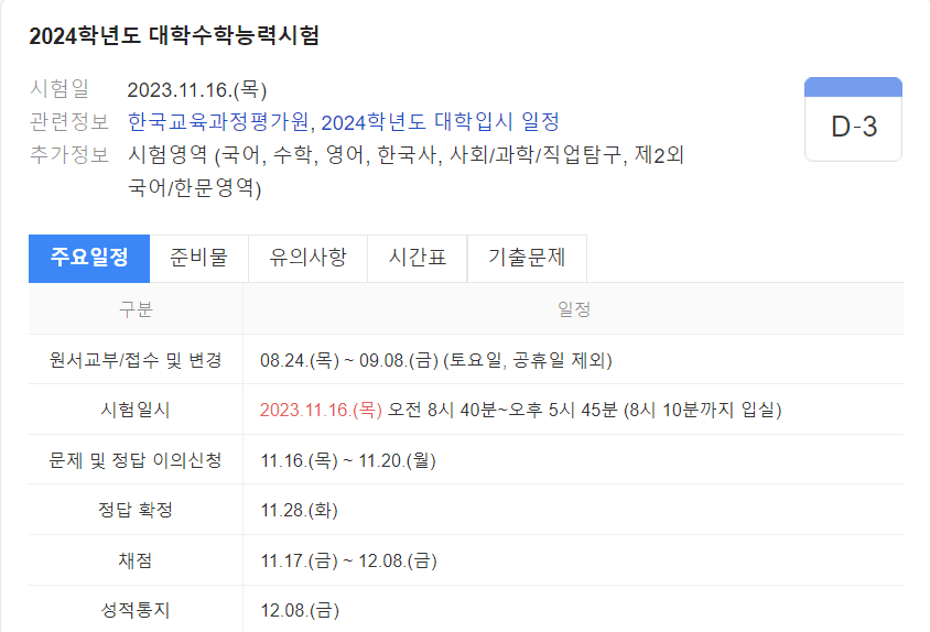 2024년 대학수학 능력 시험 일정은 2023년 11월16일(목)입니다. 시간표 및 자세한 일정은 아래 한국교육평가원에서 바로 확인할 수 있게 링크 남겨드리겠습니다.